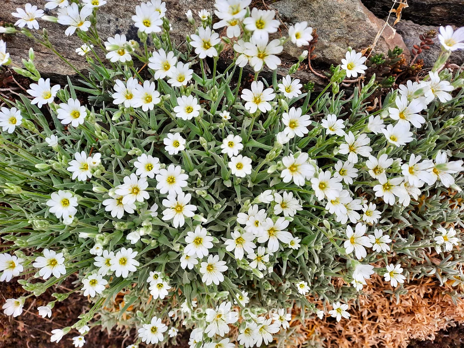 Mit sonnigen und trockenen Standorten wie Trockenmauern und Mauerspalten am Tappeinerweg und an anderen Promenaden sowie in privaten Steingärten kommt auch das Filz-Hornkraut (Cerastium tomentosum L.) gut zurecht. Die aus Süditalien stammende Pflanze ist als Zierpflanze seit dem frühen 17. Jh. bekannt. Die Gattungsbezeichnung Cerastium leitet sich vom griechischen κέρας = Horn ab und bezieht sich auf die hornförmig gekrümmten Samenkapseln. Die Artbezeichnung tomentosum (lat.) = filzig beschreibt die feine Behaarung der Pflanze.