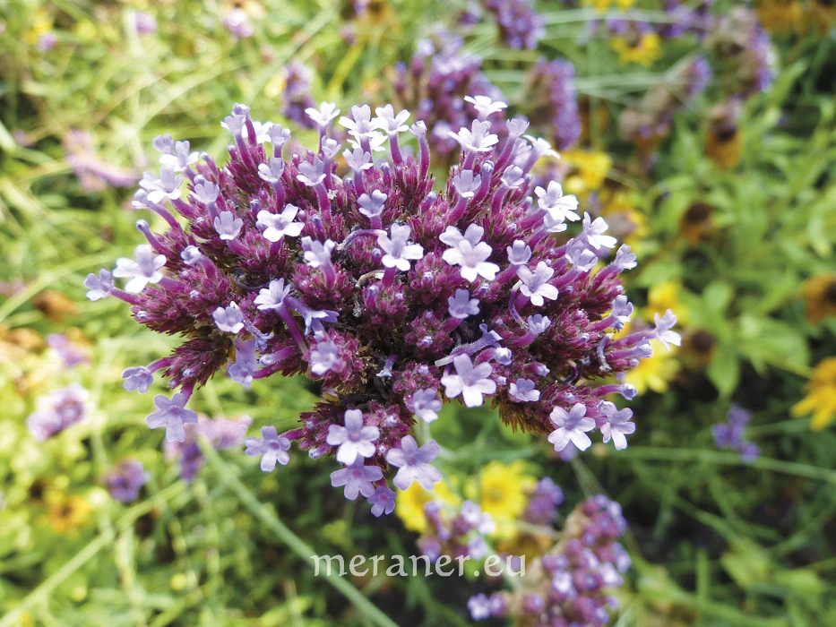 Die mehrjährige, bis 80 cm hohe, vielfach verzweigte, krautige Staude trägt vom Spätsommer bis zum Herbst an der Spitze der in alle Richtungen weisenden, vierkantigen Stiele Blütenbüschel mit angedeutet zweilippigen Blüten. Die veilchenblauen bis purpurfarbenen Blütenblätter sind röhrig verwachsen und sitzen in einer fein behaarten Kelchröhre. Die Blätter sind länglich-oval bis lanzettlich und umfassen den Stängel. Die in kantigen Nüsschen liegenden Samen säen sich selber aus, was die Gartengestalter oft nicht lieben. Sie ist eine Strukturpflanze, die gerne mit anderen Pflanzen in einem Beet gemischt wird. Die auch nur Verbene genannte Pflanze eignet sich als Schnittblume. Von ihr gibt es eine Vielzahl von Hybriden als Dauerblüher, die sich wegen ihrer Farbenvielfalt für die Gestaltung von Blumenbeeten und als Kübelpflanzen an vollsonnigen, trockenen Stellen eignen.