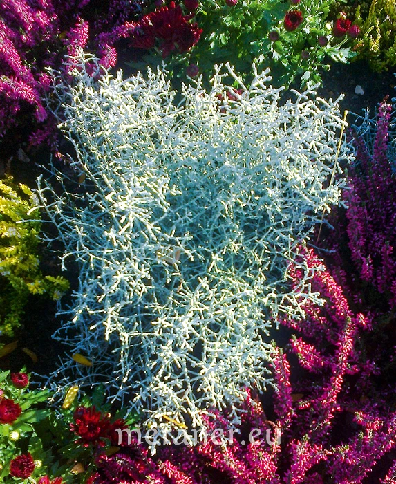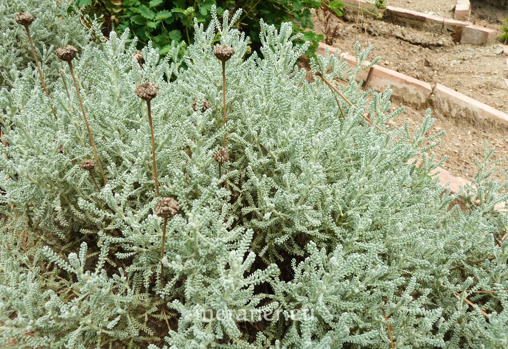 Das Silberblättrige Heiligenkraut (Santolina chamaecyparissus L.) ist ein kleiner, stark verzweigter, immergrüner Kleinstrauch mit dicht behaarten und silbrig glänzenden Blättern. Diese sind stark gefiedert und tragen mehrere Reihen kleiner Wülste, wie kleine Knospen. Lange, blattlose Stiele tragen jeweils ein halbkugeliges, gelbes Blütenköpfchen mit röhrig-glockigen Blüten.