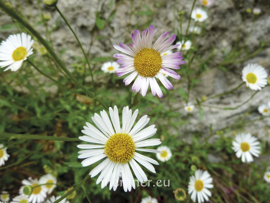 Auf 10-20 cm langen Stängeln sitzen etwa 2,5 cm große Blütenköpfchen, die innen gelbe Röhrenblüten und außen weiße, strahlenförmig ausgebreitete Zungenblüten enthalten. Diese werden später rosa bis purpurfarben. Die Blätter am unteren Teil des Stängels sind verkehrt eiförmig und vorne gezähnt, oben sind sie länglich und ganzrandig. Die Pflanze kann auch ziemlich ausgedehnte, dichte Teppiche bilden und blüht vom zeitigen Frühjahr bis zum Herbst.