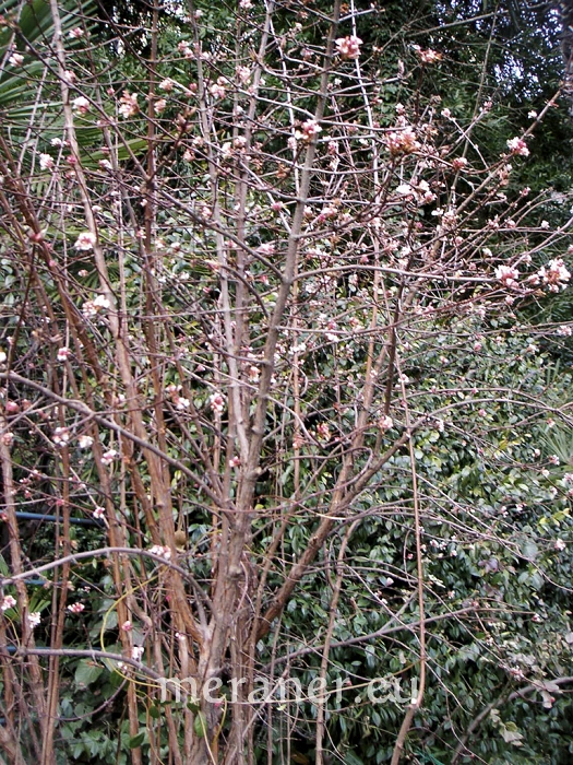 Aus den rosafarbenen Knospen entwickeln sich im Spätherbst die weißen Blüten, die am Ende der Triebe in einem trugdoldigen Blütenstand zusammenstehen. Der Strauch blüht in günstigen Jahren den ganzen Winter über bis zum Frühjahr.