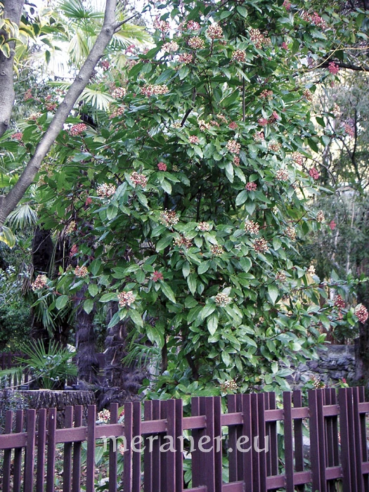 Der Lorbeerschneeball ist neben dem schon beschriebenen Erdbeerbaum ein wesentliches Element der mediterranen Macchia und dort beheimatet.