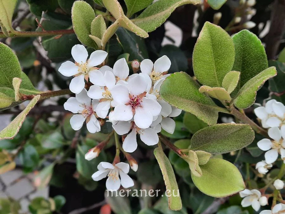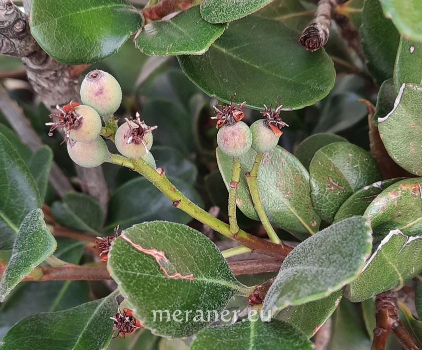Der buschige, immergrüne Strauch wird etwa 1 m hoch, die wechselständig angeordneten, länglich-ovalen Blätter sind sattgrün, ledrig und fein gesägt umrandet. Die Oberseite ist dunkelgrün, die Unterseite ist flockig filzig. Die Blüten bilden sich auf endständigen, traubigen oder rispigen Blütenständen und zieren den Strauch mehrere Monate lang, weniger auffallend sogar im frostigen Jänner. Die Blütenblätter sind weiß bis rosa, die Staubblätter und der Blütenboden anfangs weiß, später karminrosa. Die Blüten duften zur Hauptblütezeit würzig-blumig. Die etwa 1 cm großen Früchte ähneln kleinen Äpfeln, sie färben sich bei Reife bläulich bis purpurfarben-schwarz und sind essbar, aber unergiebig. Sie enthalten 1-2 dunkle, rundliche Samen.