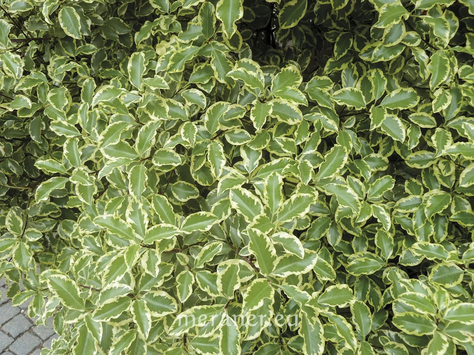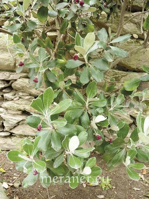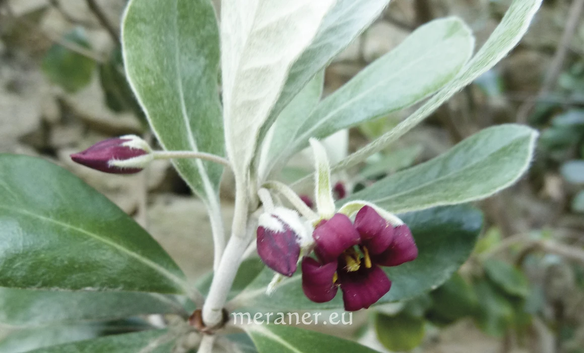 Nicht weit entfernt von vielen angenehm riechenden Sträuchern des Chinesischen Klebsamens (Pittosporum tobira, beschrieben im Meraner Stadtanzeiger Nr. 12 vom 09.06.2016) steht dieser seltene, bei uns kleine Strauch, der zur gleichen Gattung gehört. Im Frühling lugen die purpurroten Blüten aus dem graugrünen Blattwerk heraus.