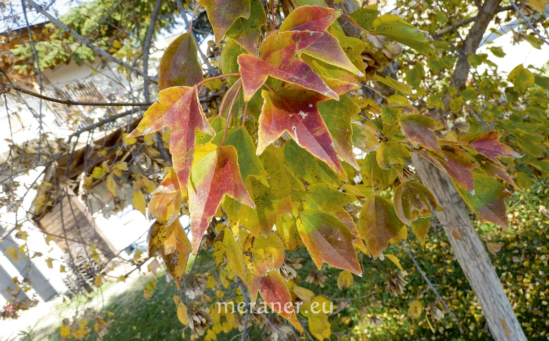 Der sommergrüne Baum kann bei uns 10-12 m Höhe erreichen und bildet eine rundliche bis eiförmige Krone. Die Stammrinde wirft größere braune Borkeplatten ab und wird wie bei der Platane fleckig. Charakteristisch sind die dreilappigen Blätter mit dreieckig geschnittenen Lappen, die an einen Dreizack erinnern. Ihre Oberseite ist glänzend dunkelgrün, die Unterseite schimmert bläulichgrün. Im Herbst färben sich die Blätter leuchtend scharlachrot (bei uns weniger ausgeprägt). Nach dem Blattaustrieb erscheinen auf endständigen Dolden in großer Anzahl die kleinen gelben Blüten, die mit reichlich Pollen und Nektar verschiedene