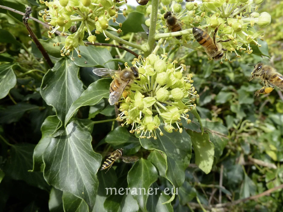 Der allgemein bekannte Efeu oder Gewöhnliche Efeu ist eine immergrüne Pflanze aus der Familie der Araliengewächse (Araliaceae) und in ganz Europa und Westasien verbreitet. Er ist sowohl im Schatten, wo andere Pflanzen wegen Lichtmangels aufgeben, als auch im Licht daheim, wo er dann auch blühen und Früchte tragen kann. An Felswänden schattiger Talschluchten und bodendeckend auf feuchten Waldböden findet man sehr schöne und flächenmäßig imposante Exemplare. An den Mauern vieler Burgen und Schlösser vermag der Efeu als Wurzelkletterer bis 20 m hoch zu klettern; abgestorbene Bäume kann er erklimmen und lebende Bäume durch das Gewicht und die Lichtkonkurrenz derart schädigen, dass diese dann eingehen. Die Pflanze blüht spät im Jahr, bei uns ab September, und bietet den Bienen, Schmetterlingen und allerlei Fliegen bis in den späten Herbst eine willkommene Weide.