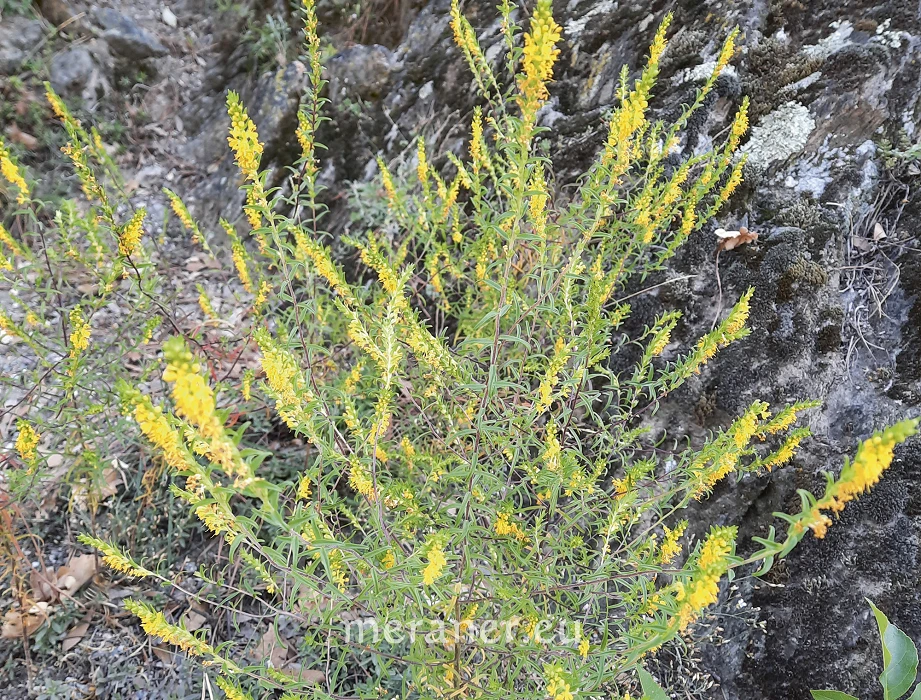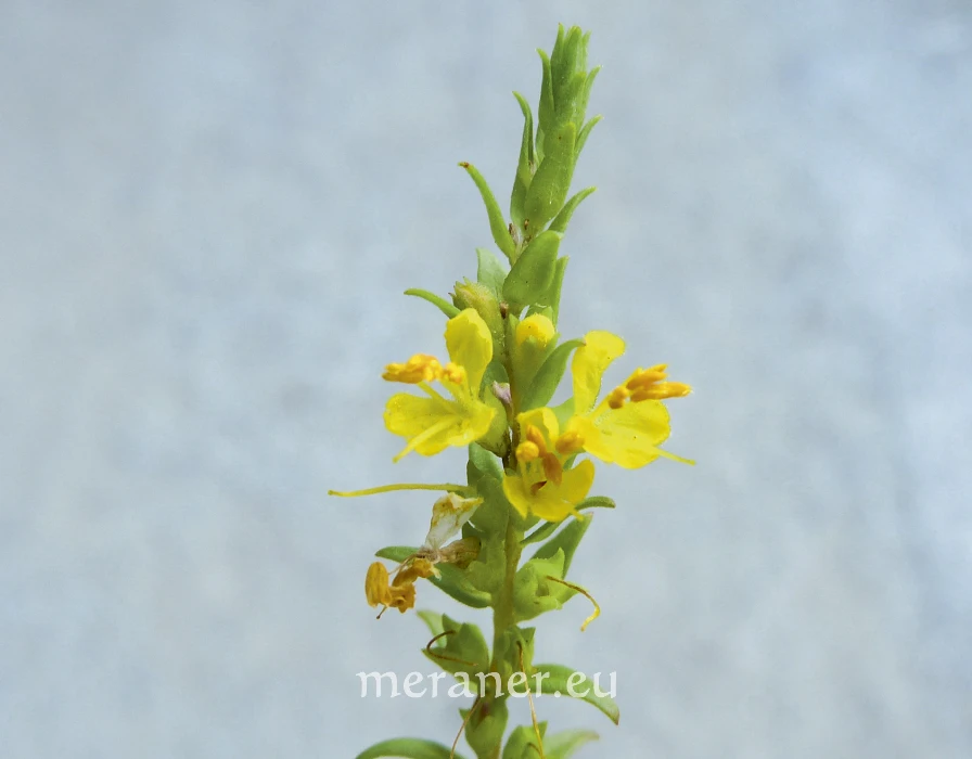 Die bis etwa 30 cm hohe, aufrecht wachsende Pflanze ist stark abstehend verzweigt. Die ledrigen Blätter sind schmal lanzettlich und meist ganzrandig. Die Blüten erscheinen in langen, einseitswendigen, ährigen Blütenständen aus den Blattachseln vom Sommer bis in den Spätherbst. Die goldgelben Lippenblüten bestehen aus einer längeren Oberlippe und einer dreigeteilten Unterlippe. Die Staubblätter und der Griffel ragen weit aus der Blüte heraus. Es bilden sich Kapselfrüchte mit zahlreichen Samen.