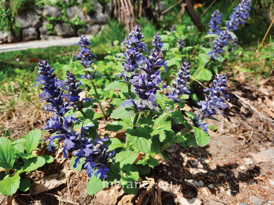 Der Genfer Günsel ist eine dem Gundermann / der Gundelrebe ähnliche Pflanze – wir haben diese im MS am 14.05.2020 vorgestellt. Während letztere mit langen Ausläufern flach am Boden kriecht, hat der auch Zottiger Günsel genannte Lippenblütler (Lamiaceae), den wir heute vorstellen, keine Ausläufer. Die in allen Teilen behaarte Pflanze wächst mehrstängelig. Die verkehrt-eiförmigen Grundblätter stehen in Rosetten und die am bis etwa 30 cm hohen, vierkantigen Stängel gegenständig angeordneten Hochblätter sind am Rande tief gekerbt, fast dreilappig und grob gezähnt. Die in stockwerkartigen Scheinquirlen stehenden Blüten sind meist dunkelblau. Die Blütenkrone ist zweilippig, wobei die winzige Oberlippe fast zu fehlen scheint; die Unterlippe ist dreilappig. Im Blütenkelch sitzen vier einsamige, nussartige Teilfrüchte. Die Behaarung schützt die Pflanze vor starker Sonneneinstrahlung und mindert damit die Verdunstung. Die Pflanze wächst auf Erdanrissen, Böschungen oder Wegrainen, auf sandigen Böden. Die Blüten liefern für Bienen und Schmetterlinge reichlich Pollen und Nektar: Die Blüten und Blätter sind wie die der Gundelrebe essbar. Das gleiche gilt für den sehr ähnlichen Kriechenden Günsel (Ajuga reptans), der mit langen Ausläufern oft in den Rasen wächst und dann meistens als Unkraut angesehen wird. Seine Blüten sind meist blau gefärbt mit helleren Streifen, auch rosafarben oder weiß.