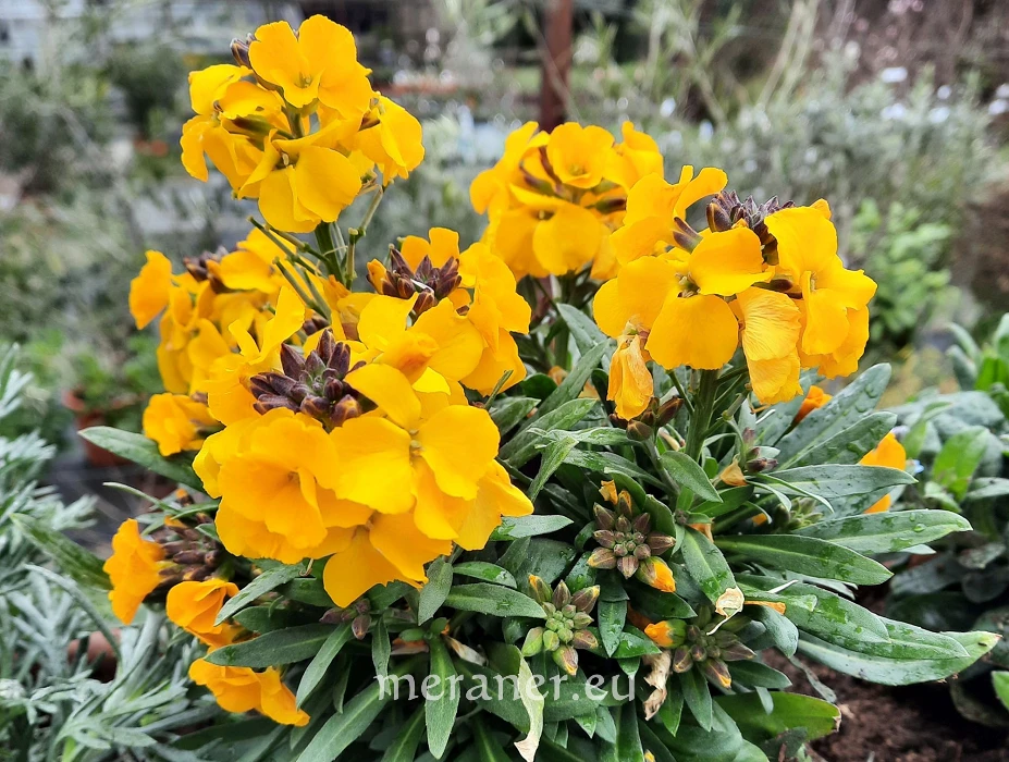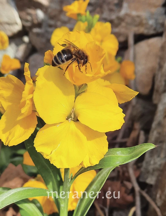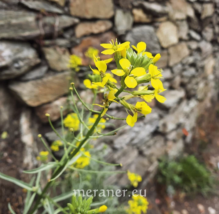 Der Goldlack ist ein Gartenflüchtling, eine vor langer Zeit eingebürgerte (er war im 16. Jh. bereits weit verbreitet) und verwilderte Zierpflanze, die in freier Natur auch in Fugen an alten Stadt- oder Burgmauern sowie in Felsfluren wächst. An einer geschützten Stelle am Tappeinerweg konnte man im Winter 2023/2024 über die goldgelben Blüten staunen.