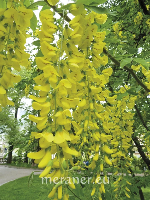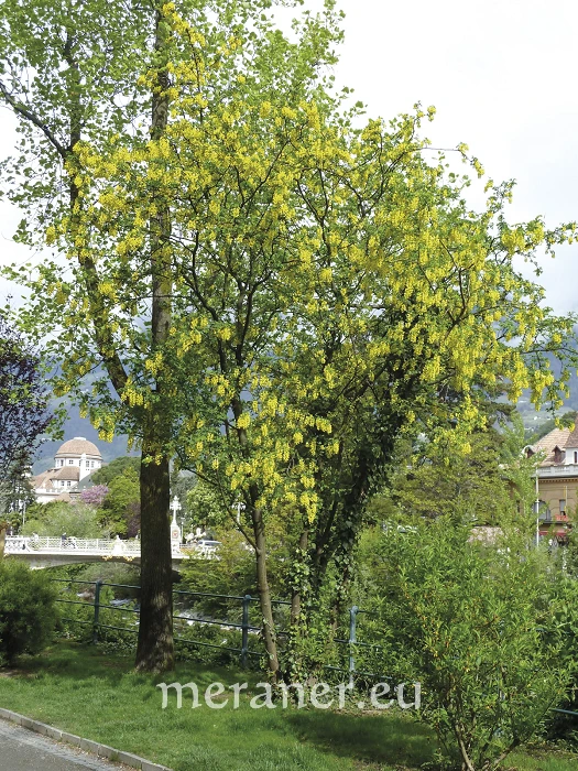 Der Goldregen gehört zu den reizvollsten Frühlingsblühern. Auch der Name beschreibt das Gehölz treffend: Im Mai färben die in langen Trauben stehenden Schmetterlingsblüten den Strauch prächtig goldgelb und verschönen für kurze Zeit mit ihrer Blütenfülle die Gärten und Parkanlagen. Es ist jedoch ähnlich wie beim Blauregen (Wisteria, im Meraner Stadtanzeiger Nr. 7 am 06.04.2012) Vorsicht geboten, besonders wenn sich Kinder im Garten aufhalten: Die Pflanze ist in allen Teilen sehr giftig!