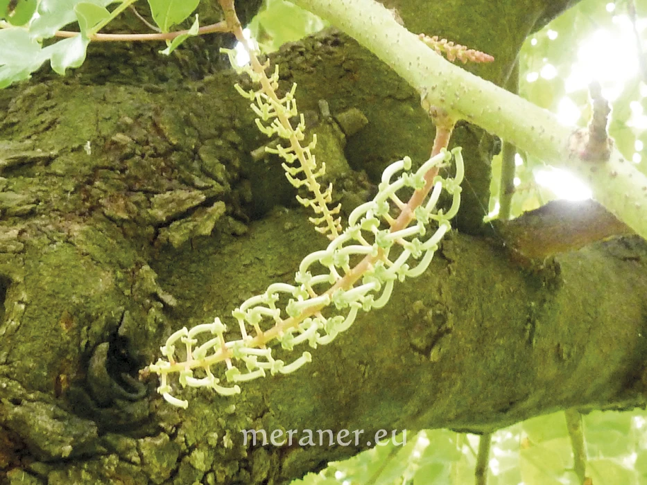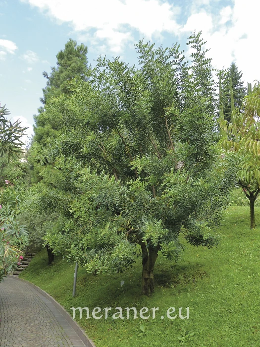 Der knorrige Stamm des immergrünen Baumes trägt eine breite Krone mit dichtem Laubwerk aus dunkelgrünen, gefiederten Blättern. Im Herbst entspringen an den Ästen und Zweigen (Kauliflorie) grüne weibliche und gelbliche oder rötliche männliche Blüten in getrennten, traubenförmigen Blütenständen meist auf verschiedenen Pflanzen. Die zuerst grünlichen, reif dann glänzend braunen Schoten enthalten mehrere braune Samen. Das nahrhafte Fruchtfleisch ist anfangs weich und karamellartig-süß, später wird es hart und dadurch lange haltbar. Die Früchte werden als süße Knabberei mit schokoladeartigem Geschmack von Kindern (früher wurden brave Kinder vom Nikolaus mit Bockshörndlen u.a. belohnt) und Erwachsenen (mit guten Zähnen) geschätzt. Schon vor 2000 Jahren wurden sie an Tiere verfüttert (Gleichnis vom verlorenen Sohn in der Bibel).