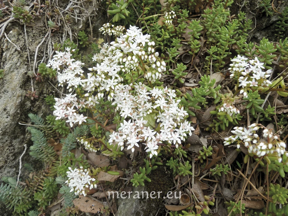 Der Weiße Mauerpfeffer (Sedum album L.) ist am Grunde mit zahlreichen niederliegenden, sterilen Trieben verzweigt. Die wechselständig angeordneten, grasgrünen Blätter sind walzenförmig. Zahlreiche weiße Blüten bilden an einem aufrechten, etwa 15 cm langen, locker beblätterten Stiel eine doldige Rispe. Diese Art wird häufig kultiviert, auch mit rosafarbenen oder grünlichen Blüten.