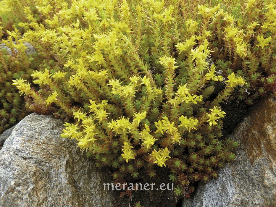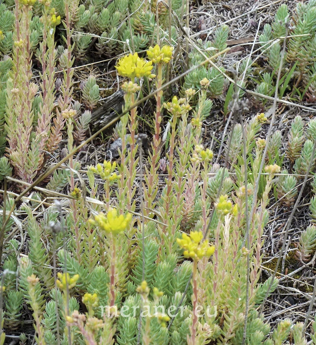 Der Milde Mauerpfeffer (Sedum sexangulare L.) bildet 3-15 cm hohe, dichte, hellgrüne oder rötliche Rasen. Die Triebe tragen zylindrische Blättchen, die meist regelmäßig in sechs Reihen angeordnet sind, was man besonders gut an den blütenlosen Trieben sieht. Die Sternchenblüten sind lebhaft gelb.