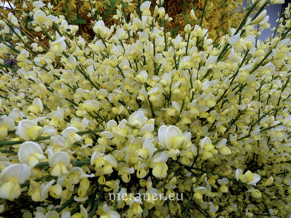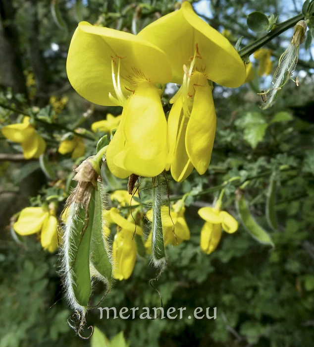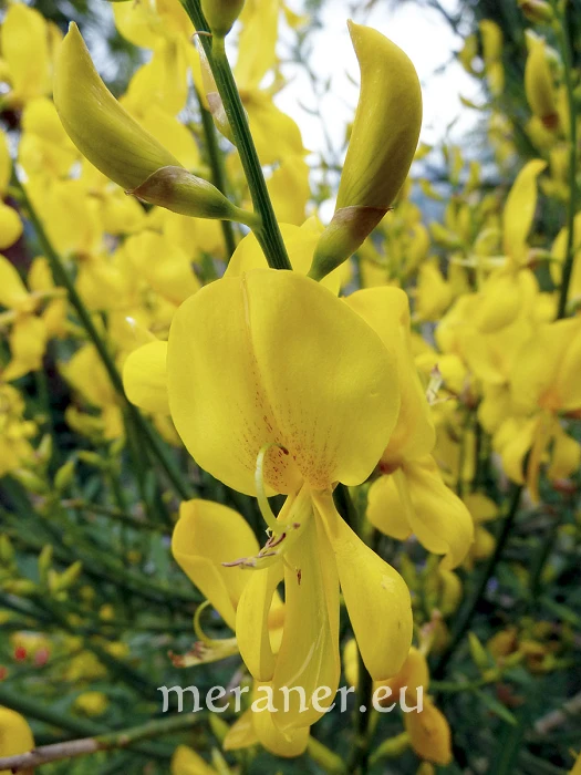 Auf den Reisen ans Mittelmeer sind uns sicher die Böschungen entlang der Autobahn und die felsigen Trockenhänge an der Küste aufgefallen, die mit dem reich blühenden Pfriemenginster bewachsen sind. Die goldgelben Blüten bilden dort einen wunderschönen Kontrast zum Blau des Meeres. Der Pfriemenginster, auch Binsenginster und Spanischer Ginster genannt, ist eine Charakterpflanze der Macchia des Mittelmeergebietes von Spanien bis zur Türkei. Er gehört zu den Schmetterlingsblütlern in der großen Familie der Hülsenfrüchtler (Fabaceae). Er zählt zu den sogenannten Rutensträuchern, die schon im Frühsommer ihre Blätter abwerfen; die Photosynthese vollzieht sich dann in den grünen Zweigen. Der Pfriemenginster ist so gut an Trockenstandorte angepasst.