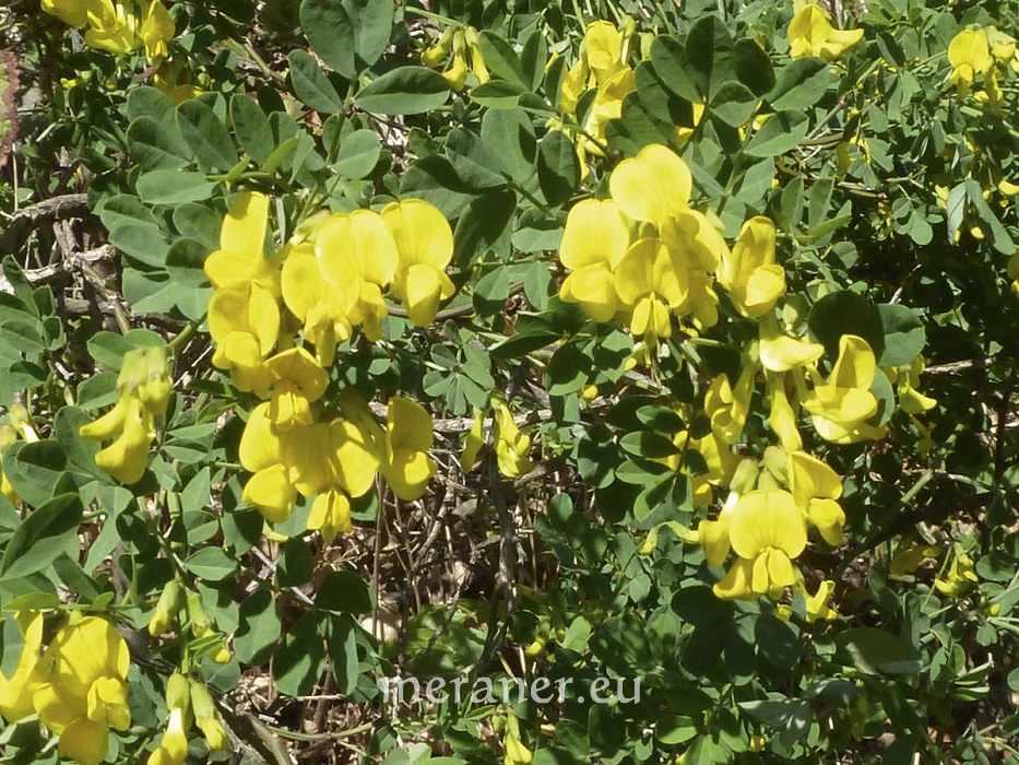 Der sommergrüne Kleinstrauch, die Strauchkronwicke (Hippocrepis emerus (L.) Lassen, Synon.: Coronilla), ist in den mit Flaumeichen bestockten Wäldern rund um Meran, im Etschtal und Vinschgau häufig anzutreffen (man begegnet ihr am Tappeinerweg, am Algunder und Marlinger Walweg und anderen Wanderwegen im Meraner Gebiet). Der aufrechte bis leicht überhängende Strauch hat grüne, kantige Zweige, unpaarig gefiederte Blätter und goldgelbe Schmetterlingsblüten, die in der Umgebung von Meran schon zeitig im Frühling erscheinen. Aus ihnen bilden sich einige cm lange, hängende, schmale Schoten mit den Samen.