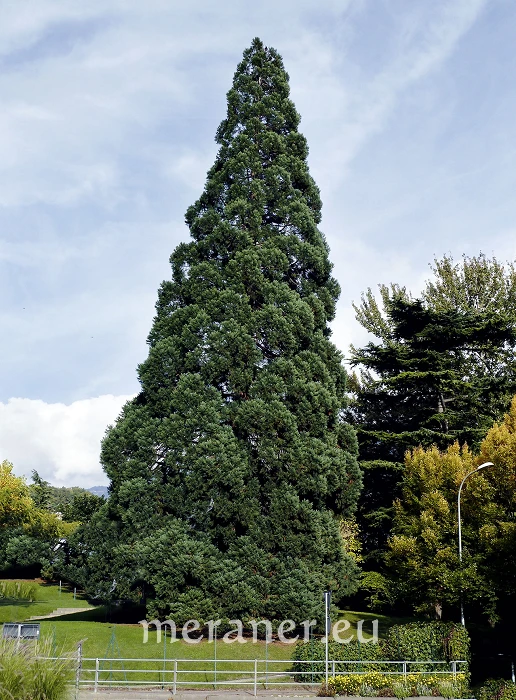 Nach historischen Angaben wurde um das Jahr 1859 in der Gartenanlage des Dr. Franz Putz, des damaligen Besitzers des Parks, heute Seniorenheim Seisenegg, ein Riesen-Mammutbaum gepflanzt, der somit der älteste Mammutbaum in Meran, in Südtirol und Italien ist und wohl auch einer der ältesten in Europa. Im Park der Villa Mathilde in Obermais stand bis 2013 der dickste Mammutbaum in Meran (sein Schutz wurde aus Sicherheitsgründen aufgehoben und er wurde zur Fällung freigegeben).