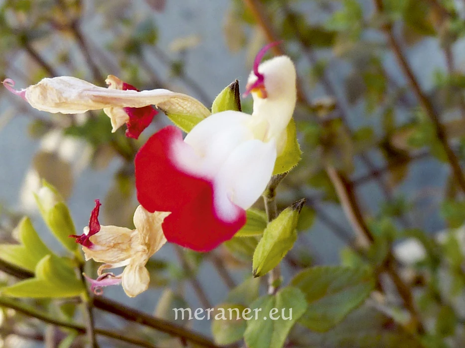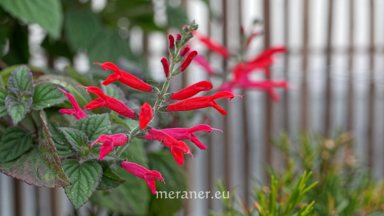 An geschützten Standorten begleiten uns noch im Dezember Pflanzen mit farbenprächtigen Blüten – der heftige Schneefall Anfang Dezember 2020, der viele Bäume, Sträucher und Kräuter stark beschädigt hat, hat sie teilweise verschont. Dabei handelt es sich um drei Salbei-Arten. Von den weltweit etwa 900 Salbei-Arten – sie gehören zur Familie der Lippenblütler (Lamiaceae) – gibt es einen Teil, der seit alters medizinisch in der Kräuterapotheke und als Gewürz in der Küche verwendet wird. Der wichtigste und bekannteste ist der Echte Salbei (Salvia officinalis L.). Ein anderer Teil hat einfach nur einen besonders hohen Zierwert.