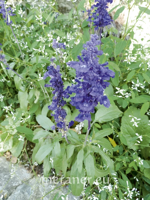 Der Mehl-Salbei (Salvia farinacea Benth.) ist eine beliebte Zierpflanze, sie ist aber weder essbar, noch duftet sie. Den Namen erhielt die Pflanze wegen der behaarten Stängel, Blätter und Knospen, die wie mit Mehl bestäubt aussehen. Der Ährige Salbei, wie die Pflanze auch genannt wird, wächst aufrecht und buschig etwa 40-60 cm hoch und hat schmal- bis eiförmig-lanzettliche Blätter. Die Lippenblüten stehen einzeln in Scheinquirlen zusammen auf ährigen Blütenständen und leuchten in Blautönen oder reinem Weiß vom Frühling bis zum Herbst. Die Pflanze ist ursprünglich in Nord- und Mittelamerika beheimatet.