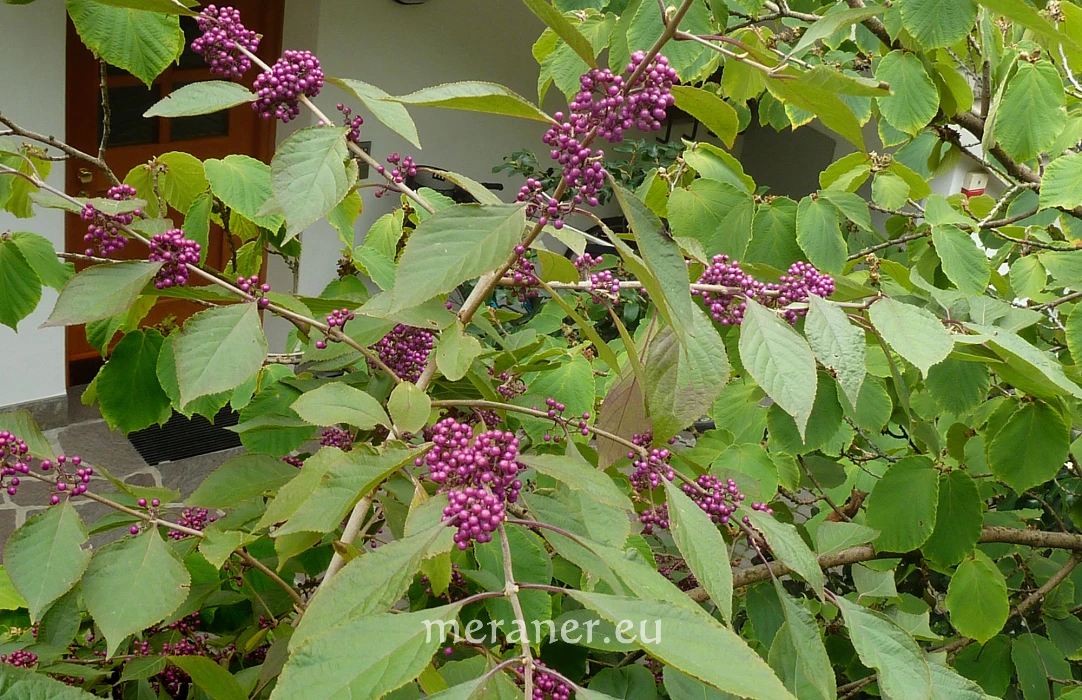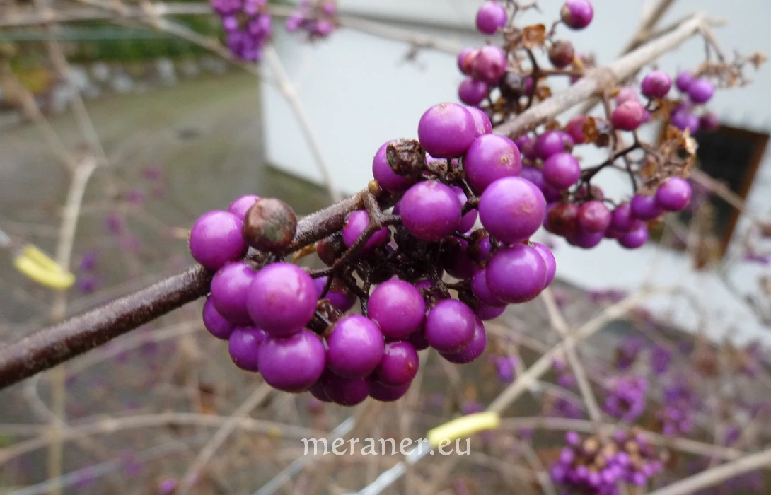 Der Reiz der Chinesischen Schönfrucht, die eher unter dem Namen Liebesperlenstrauch bekannt ist, liegt im ganz besonderen Fruchtbehang mit der geheimnisvollen, glänzend violetten Färbung der Steinfrüchte, die im Herbst und Winter den Strauch schmücken.