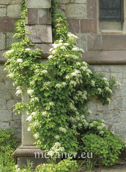Die Kletter-Hortensie (H. petiolaris Sieb. & Zucc.) klammert sich mit Hilfe von kräftigen Haftwurzeln (ähnlich dem Efeu) auch an fast glatten Mauern fest oder sie findet an Geländern eine Stütze; findet sie keinen Halt, bildet sie einen halbkugeligen Busch. Die oberseits glänzend grünen Blätter färben sich im Herbst goldgelb. Die weißlichen, süßlich duftenden Blüten stehen in schirmförmigen, flachen Dolden.