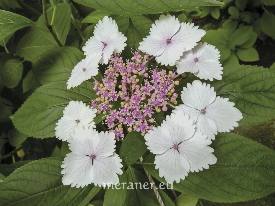 Die Teller-Hortensie (H. serrata ´koreana´ (Thunb.) Ser.) ist gewöhnlich etwas kleiner im Wuchs als die Bauern-Hortensie, sie hat aber besonders große Scheinblüten, wobei die sterilen und fertilen Blüten unterschiedlich gefärbt sind.
