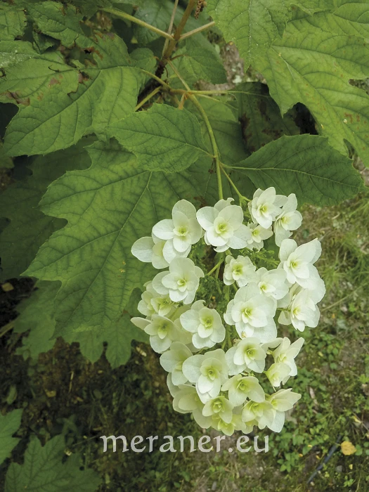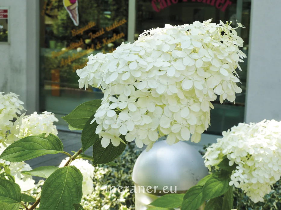 Ein attraktiver Zierstrauch ist die Rispen-Hortensie (H. paniculata Sieb.). Je nach Sorte bilden sich im Hochsommer etwa 30 cm lange, dicht behaarte, kegelförmige Blütenrispen mit wenigen kleinen fertilen Blüten und vielen großen sterilen Schaublüten. Diese sind zunächst grünlich-weiß, dann cremeweiß, beim Verblühen rosa. Die dunkelgrünen Blätter sind beiderseits an den Nerven behaart. Durch die Größe der Blüten und die Blühfreudigkeit fällt besonders die stadtklimafeste Sorte ´Limelight´ auf.