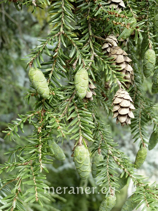 Der Baum, auch Kanadische Schierlingstanne genannt, ist eine Pflanzenart in der Familie der Kieferngewächse (Pinaceae). Er ist beheimatet in Nordost-Amerika und wurde um die Mitte des 18. Jhs. nach Europa eingeführt und in Parkanlagen und Gärten als Zierbaum gepflanzt. Der Name hemlock (engl.) bedeutet Schierling (es ist ein giftiger Doldenblütler mit dem Geruch nach Mäuseharn) und bezieht sich auf den unangenehmen Geruch zerriebener Nadeln.
