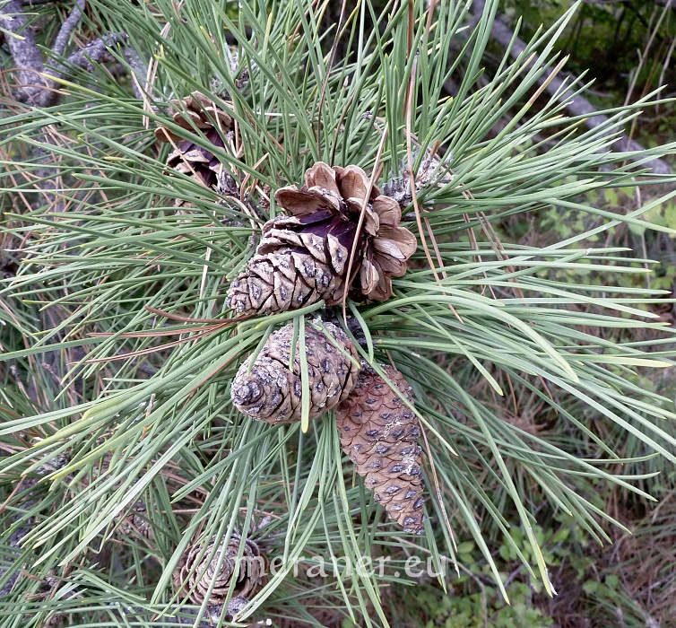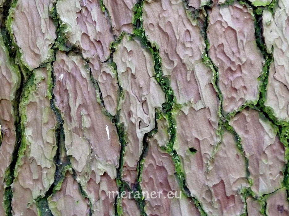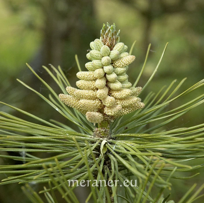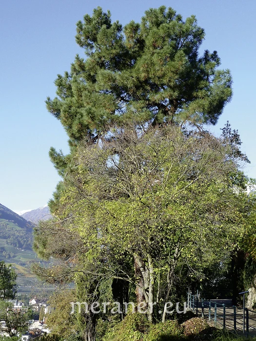 Aus dem westlichen Mittelmeergebiet stammt die Strand-Kiefer (Pinus pinaster Ait.). Der Baum erreicht 20-30 m Höhe mit anfangs kegelförmiger, später unregelmäßiger und abgeflachter Krone. Die dicke Borke reißt bei älteren Bäumen tief ein 3 und bildet rotbraune Platten. Die matt glänzend dunkelgrünen, steifen und stechend zugespitzten Nadeln werden über 15 cm lang und stehen zu zweien gebündelt an den Enden der Kurztriebe. Die bis 20 cm langen, glänzenden, braunen Zapfen stehen meist zu mehreren sternförmig angeordnet an den Zweigen; deswegen wird der Baum auch Igel- und Stern-Kiefer genannt. Die Zapfenschuppen tragen einen kurzen, dornartigen Fortsatz. Die Strand-Kiefer findet man am Tappeinerweg und in der Gilf, in der Lorbeergasse, im Park von Martinsbrunn, auch in großen privaten Gärten.