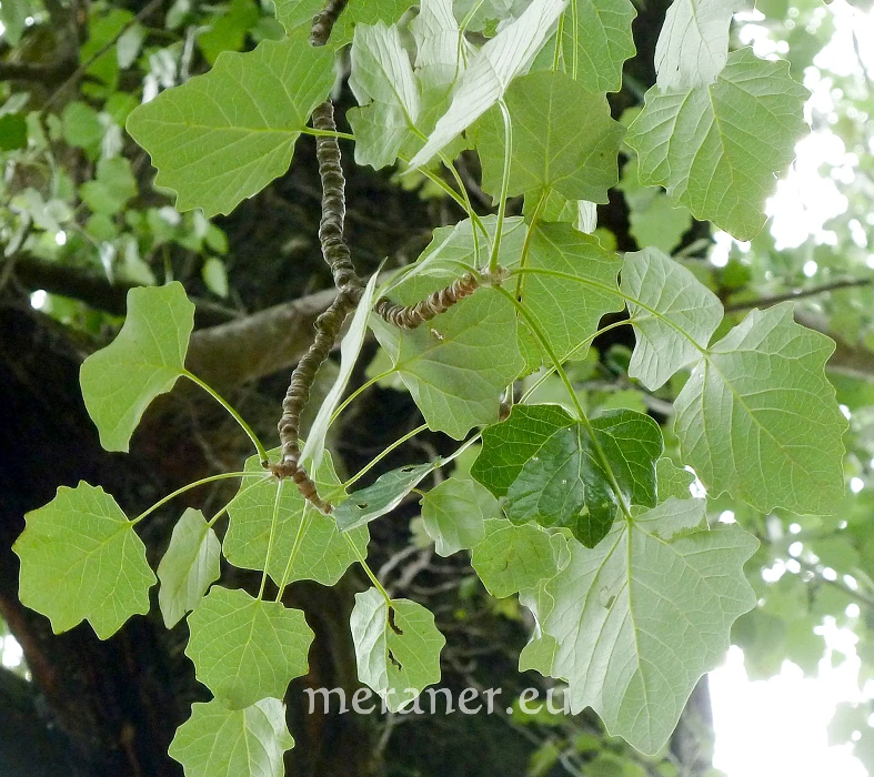 Die an ihrer Unterseite dauerhaft weiß-filzig behaarten Blätter machen die Silber- oder Weiß-Pappel (Populus alba L.) zu einem unverwechselbaren, schmückenden Baum. Diese im Mittelmeerraum und in weiten Teilen Südwestasiens heimische Pappel besiedelt gerne Flussufer und Auwälder außerhalb von Überschwemmungsgebieten; sie wächst auch auf trockenen, sandigen und humosen Böden und aufgelassenen und verwilderten Lagerplätzen.
