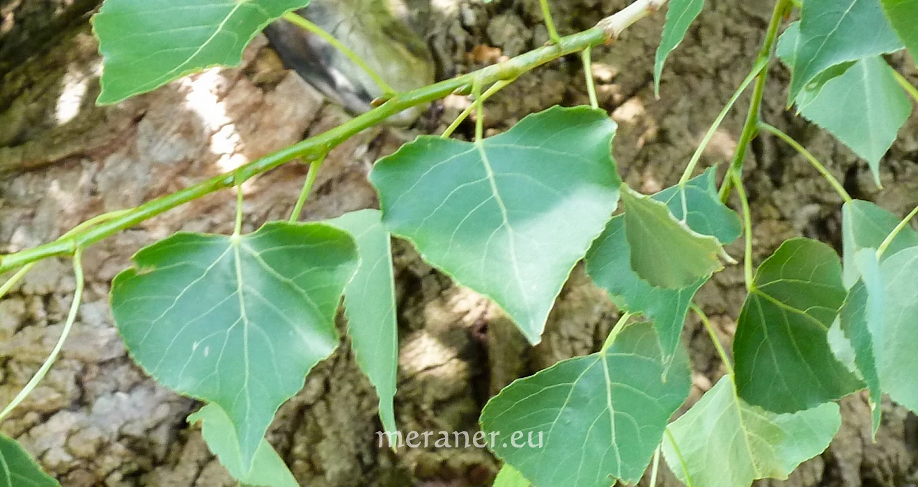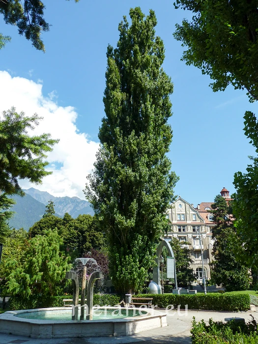 Als schlankwüchsiger Alleebaum prägt die Pyramiden-Pappel (Populus nigra `italica`) oder Säulen-Pappel eindrucksvoll Straßenzüge und Plätze. Entstanden ist sie aus der Schwarz-Pappel durch eine spontane Änderung des Erbgutes. Nach ihrer Entdeckung in der Lombardei eroberte sie ab dem 18. Jh. in kürzester Zeit die Gebiete nördlich der Alpen und brachte, weil sie in der Wuchsform der Mittelmeerzypresse (Cupressus sempervirens, Meraner Stadtanzeiger Nr. 2 vom 27.01.2012) ähnelt, südländisches Flair in die kälteren nördlichen Regionen. Angeblich hat Napoleon diesen Baum stark verbreitet, indem er ihn entlang seiner Heerstraßen pflanzen ließ.