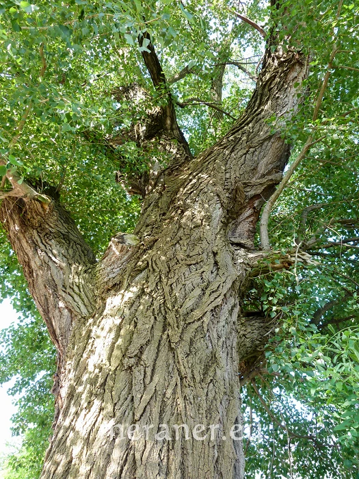 Die schwärzliche Rinde ist das kennzeichnende Merkmal der Schwarz-Pappel (Populus nigra L.). Der Baum kann eine Höhe bis 30 m erreichen, hat eine mächtige, fast so breite wie hohe Krone mit weit ausladenden Ästen und bildet reichlich Wurzelbrut. Alte Stämme tragen oft dicke Knollen. Die Rinde reißt im Alter mit tiefen Rillen längs auf, die auffallend x-förmig verbunden sind. Die verschieden geformten, dreieckigen bis eiförmigen Blätter haben einen langen Stiel und eine ausgezogene Spitze, sie sind am Rande fein gesägt, beidseitig glänzend grün und unbehaart.