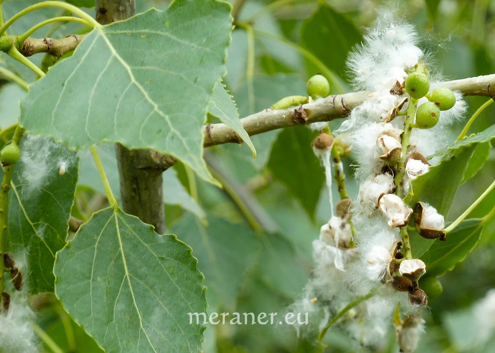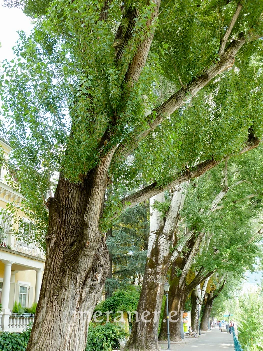 Die Pappeln gehören zur Familie der Weidengewächse (Salicaceae) mit formenreichen und oft schwer zu unterscheidenden Arten. Als Zierbäume und Schattenspender sind in Merans Parkanlagen und Promenaden die europäischen Arten Schwarz- und Pyramiden-Pappel, Grau-Pappel, Silber- oder Weiß-Pappel und Zitterpappel vertreten. Zu ihnen gesellt sich die Kanadische Pappel. Den Namen populus übernahm Linné von Plinius dem Älteren, der drei Pappelarten, die Schwarz-, Silber- und Zitterpappel, in seinen „Naturalis historia“ (ca. 77 n. Chr.) angeführt hat.