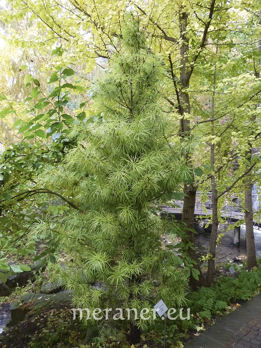 Vorkommen: in den Gärten von Schloss Trauttmansdorff, im Garten an der Katharinastraße 4, im Park von Seisenegg, bei der Villa Rieder in der Verdistraße, an der Georgenstraße (Villa Harpf), beim Gasthof Ofenbaur u.a.O. Wegen der schmucken Benadelung wird die Schirmtanne gerne als Topfpflanze bei Eingängen von Geschäften und Bars aufgestellt (z.B. in den Meraner Lauben, in St. Leonhard/Passeier).