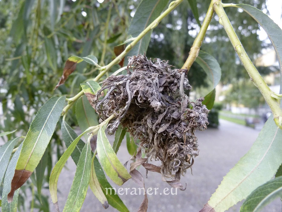 Aus der Kreuzung von Salix alba ´tristis´ mit Salix babylonica ist Salix x sepulcralis Simonk. hervorgegangen, deren Sorte ´chrysocoma´ mit den sehr dünnen, goldgelben Zweigen besonders im Winter ein Blickfang ist. Die schmal-lanzettlichen Blätter bleiben im Herbst bis zum Frost grün und fallen dann allmählich ab. Im Winter fallen die „Wirrzöpfe“ an den Zweigen auf; es sind dies gestauchte Sprosse, hervorgerufen durch Gallmilben.