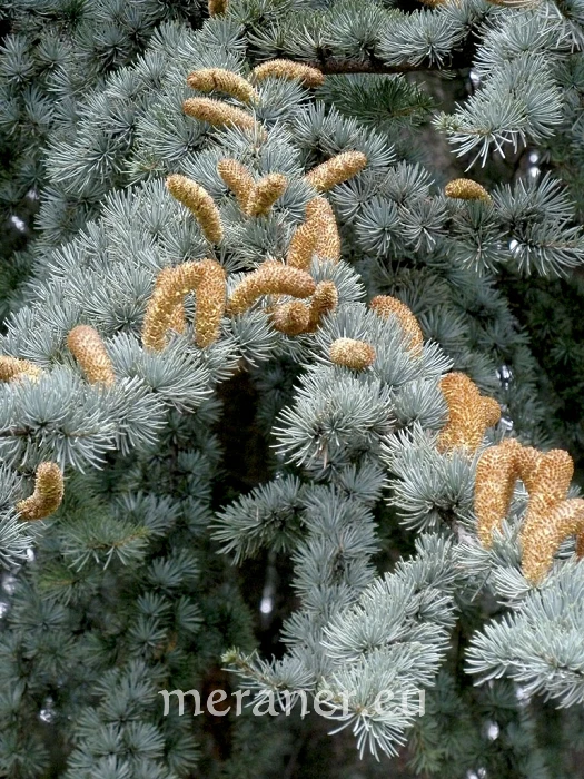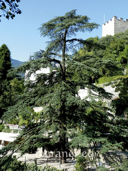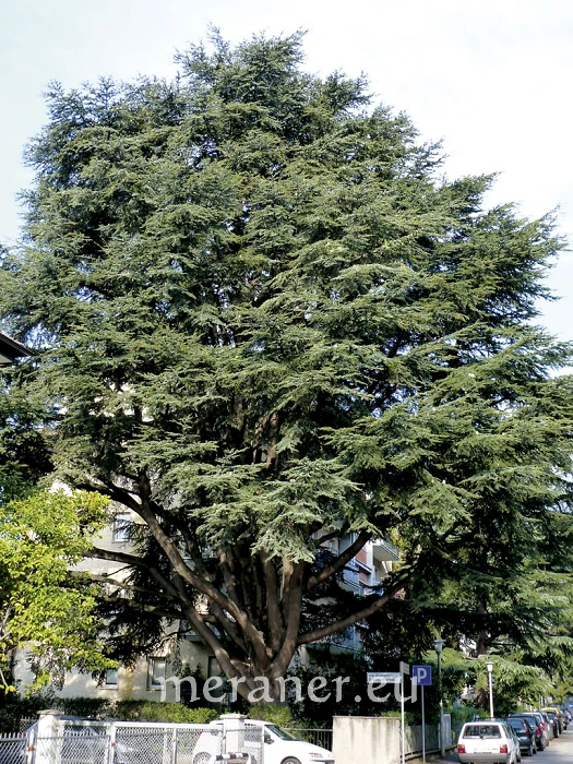 Die Himalaja-Zeder, auch Deodar-Zeder genannt [Cedrus deodara (D. Don.) G. Don.] ist gekennzeichnet durch eine breitpyramidale Krone, deren langer Leittrieb peitschenartig überhängend und die Zweigenden nach unten hängend sind. Die Äste stehen waagrecht ab. Die weichen Nadeln sind jung noch hellgrün bis blaugrün, später dunkelgrün und mit 3-5 cm die längsten der Zedernarten. Die bis 12 cm langen Zapfen sind fassförmig. Die Heimat dieser Zedernart sind die Bergwälder des Himalajagebietes, wo sie eine Größe bis 50 m bei einem Umfang von 10 m erreicht. Die Himalaja-Zeder ist die häufigste Zedernart in Meran. Wegen des dauerhaften Holzes gilt die Zeder als Sinnbild für Kraft und Würde, man findet sie häufig in Friedhöfen und sie ist das Symbol für Unsterblichkeit. In vielen Kulturen gilt die Zeder als Baum Gottes.