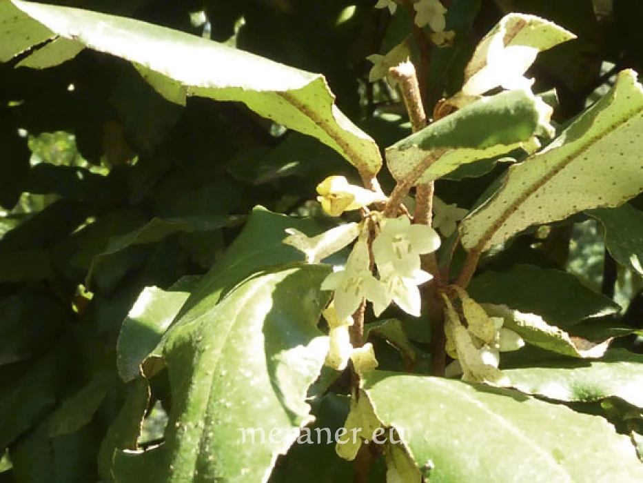 Der langsam wachsende Strauch hat eine sparrig verzweigte Wuchsform, erreicht Höhen von 3-4 m und ist mit Dornen ausgestattet. Eine Eigentümlichkeit des Strauches besteht darin, dass Zweige der langen Triebe unter einem stumpfen Winkel abwärts gebogen sind, Ranken bilden und das Emporklimmen ermöglichen (Honeck 1977). Die Rinde der jungen Zweige ist dicht braun beschuppt. Die länglich-elliptischen, etwa 7-12 cm langen Blätter sind an den Rändern etwas gewellt und zurückgebogen, oberseits glänzend dunkelgrün und mit Sternhaaren punktiert, unterseits durch feine Sternhaare silbrig oder bronzefarbig glänzend. Die cremeweißen Blüten erscheinen im Herbst; sie hängen an einem kurzen Stiel abwärtsgerichtet und erscheinen zu wenigen zusammengefasst in den Blattachseln der Triebe. Die vier weißen oder innen gelben Kelchblätter sind röhrig verwachsen und in der Form einer kleinen Gewürznelke auffallend ähnlich. Sie verbreiten einen schweren, süßlichen Duft, der schon von weitem bemerkbar ist. Im Frühjahr reifen gelegentlich etwa 15 mm lange, walzenförmige, braun-rot gefärbte Steinfrüchte mit nur einem Samen, an der Oberfläche sind sie mit Sternhaaren besetzt und schuppig; sie sind ein Leckerbissen für die größeren Singvögel. Die Früchte können roh oder gekocht gegessen werden, sobald sie reif sind; sie haben einen leicht säuerlichen Geschmack.