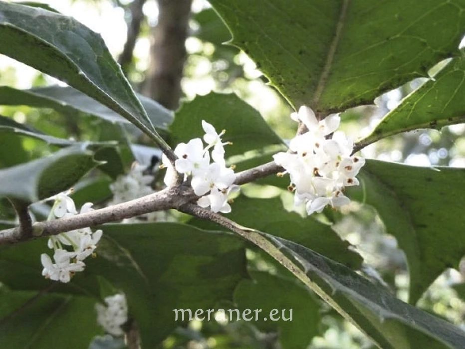 In den Meraner Parkanlagen finden wir noch weitere Arten wie den kältetoleranten Osmanthus heterophyllus; die orange blühende Varietät Osmanthus fragrans var. aurantiaca mit strauchförmigem und kleinerem Wuchs. Die Blätter der winterharten Hybride Osmanthus x fortunei (Kreuzung von Osm. fragrans mit Osm. heterophyllus) erinnern an die Blätter der Stechpalme (Ilex aquifolium), die einer anderen Familie angehört und deren Blätter spiralig angeordnet sind.
