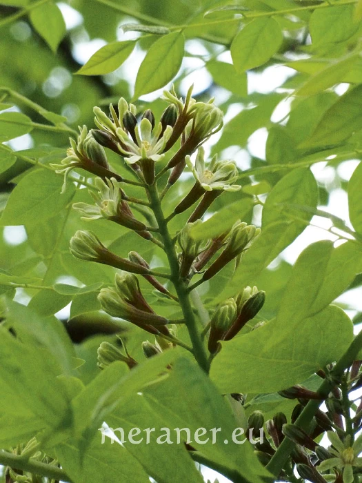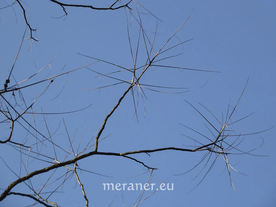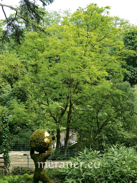 Julius Hermer beschreibt in seinem „Büchlein“ über „Die Pflanzen in den Anlagen und Gärten von Meran-Mais“ (1905) den Amerikanischen Schusserbaum, wie der Geweihbaum auch genannt wird, in der Gilfanlage auf der „Kanzel“ unterhalb der Zenoburg. Heute findet man zwei Exemplare am rechten Passerufer beim Gilfsteg, der seit 1960 die Gilfpromenade mit der Sommeranlage verbindet. Der Reiz des Baumes liegt in der geweihförmigen Verzweigung der Äste, in den großen gefiederten Blättern im Sommer und den blattlosen Stielen, die im Spätherbst und Winter bizarr an den Ästen stehen.
