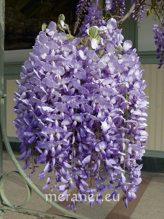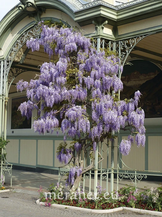 Im April hüllt das Blütenmeer der Glyzine Balkone, Mauern und Gartenzäune, Bäume, Pergolen und Rankgerüste über Hauseingängen und Parkplätzen ein. Die prachtvollen blassvioletten, oft amethystfarbenen oder rosa getönten und auch rein weißen Trauben mit Schmetterlingsblüten erscheinen in Massen vor den Blättern und verströmen noch dazu einen angenehmen Duft.