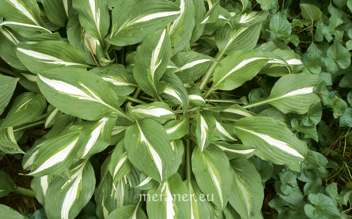 Die Weißrand-Funkie (Hosta sieboldii) oder auch Schmalblatt-Funkie hat dünne, lanzenförmige Blätter mit dem charakteristischen schmalen, weißen Blattrand und den violetten und weiß gestreiften Blüten.