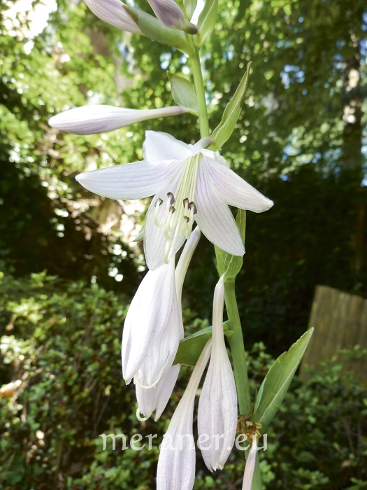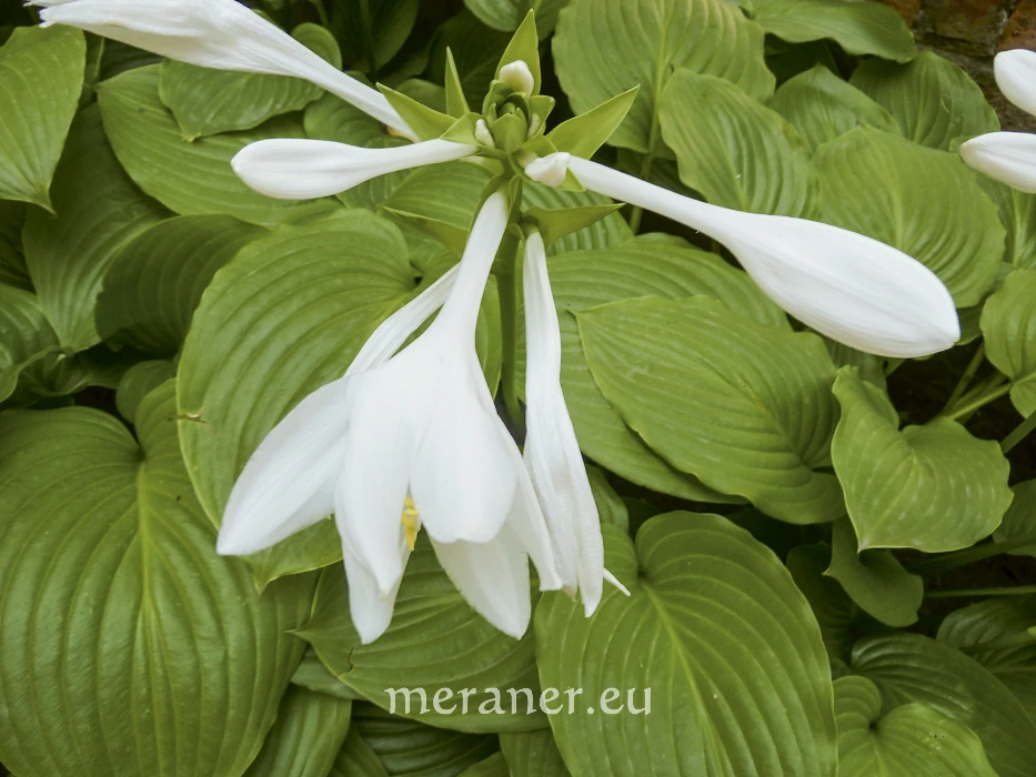 Die Lilien-Funkie (Hosta plantaginea) hat herzförmige bis rundliche grüne Blätter und bis 10 cm große, intensiv und angenehm duftende, weiße Lilienblüten.