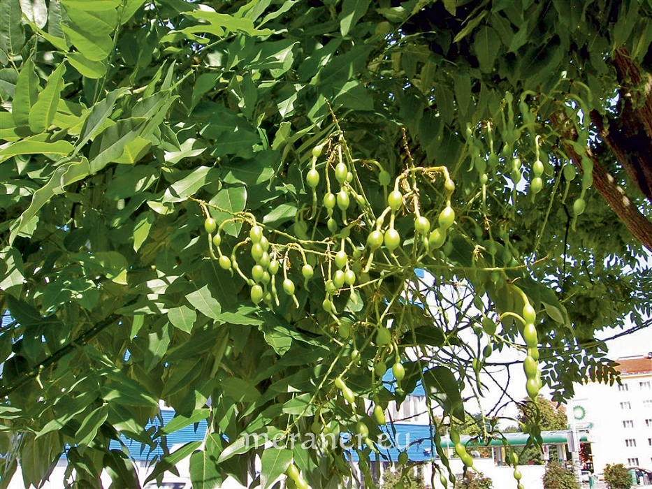 Der Hülsenfrüchte tragende Baum ist eine Pflanzenart in der Unterfamilie der Schmetterlingsblütler (Faboideae). Auf den ersten Blick kann man den Schnurbaum leicht mit der Robinie verwechseln, da die Blätter ebenfalls unpaarig gefiedert sind; beim Schnurbaum laufen jedoch die eiförmigen Blättchen vorne spitz zu und sind auf der Unterseite graugrün behaart; jene der Robinie sind oval, vorne abgerundet und unbehaart; auch trägt der Schnurbaum keine Dornen.