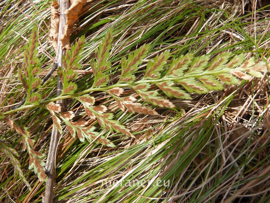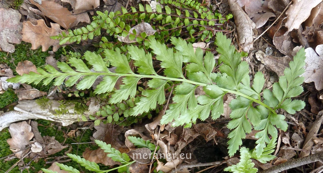 Die Wedeln des Immergrünen oder Schwarzstieligen Streifenfarns (Asplenium adiantum-nigrum L.) wachsen oft büschelig aus einem kurzen, kriechenden bis aufsteigenden Wurzelstock. Sie werden 10-30 cm lang, sind im Umriss dreieckig und in eine lange Spitze ausgezogen. Sie fühlen sich ledrig an und glänzen dunkelgrün. Die Fiederchen sind schmal oval und spitz gezähnt. Der Stiel ist oft bis zur Blattspreite glänzend schwarzbraun. Die länglichen Sori weisen schräg nach außen. Der Farn ist vorwiegend im steilen südexponierten Flaumeichenbuschwald des Küchelberges zu finden, auf Felsen und aus Mauerritzen wachsend.