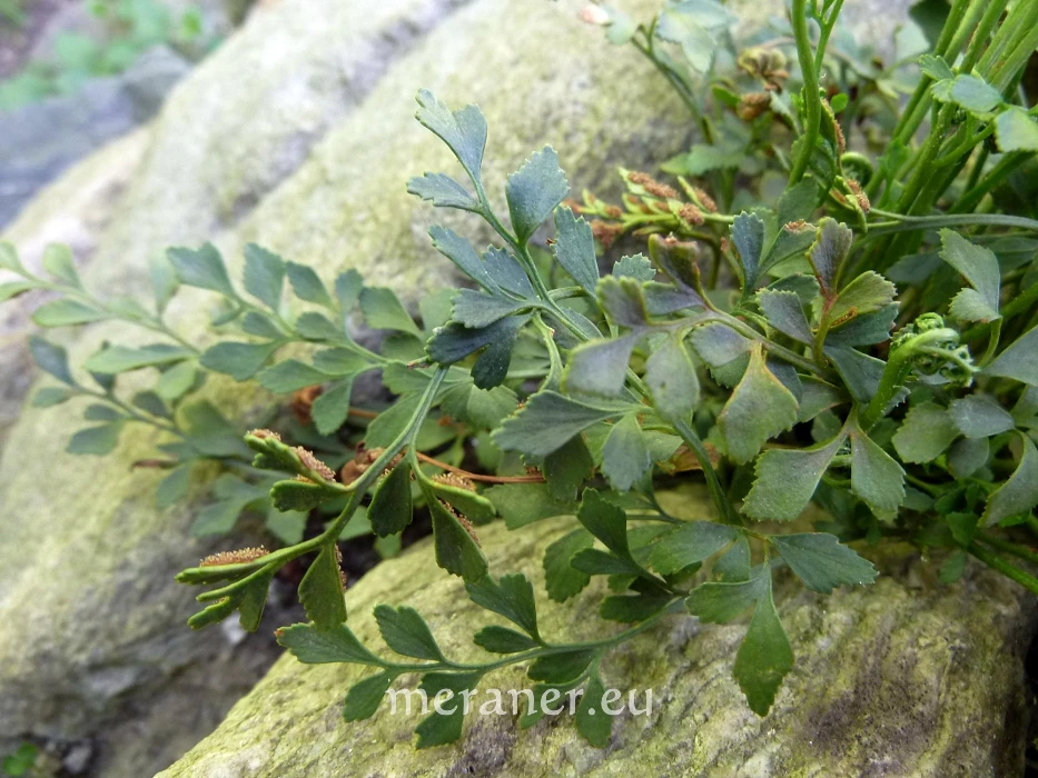 Die immergrüne Mauerraute, auch Mauer-Streifenfarn (Asplenium ruta-muraria L.) hat bis 15 cm lange, mehrfach gefiederte Blätter mit rautenförmigen Fiederchen, die vorne meist fein gezahnt sind. Die Sori sind strichförmig angeordnet und schräg nach außen ausgerichtet, reif bedecken sie oft die ganze Unterseite.
