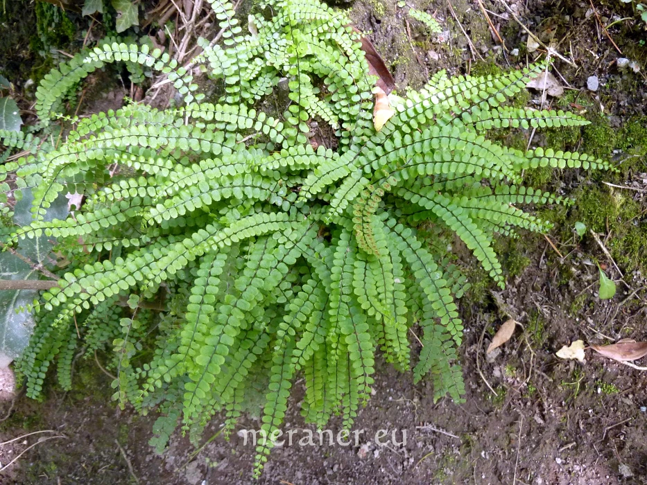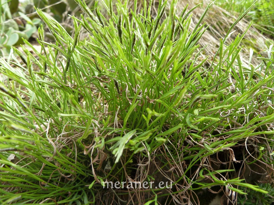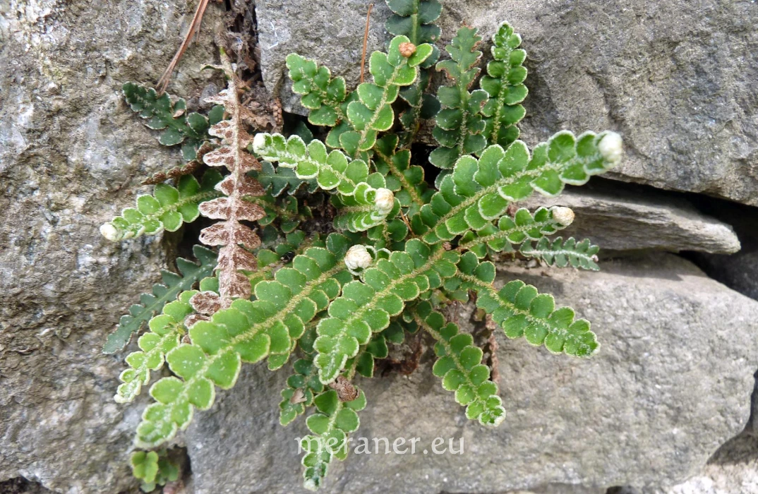 Ein Kleinfarn, der mit Vorliebe Fugen in Trockenmauern und Felsen sowie sonnige und trockene Steingärten besiedelt, ist der immergrüne Braunstielige Streifenfarn (Asplenium trichomanes L.). Eine bis 20 cm lange, schwarzbraune Spindel (Stiel + Mittelrippe des Blattes) trägt an zwei Seiten rundliche bis längliche Fiederblättchen, an deren Unterseite längliche Sori liegen.