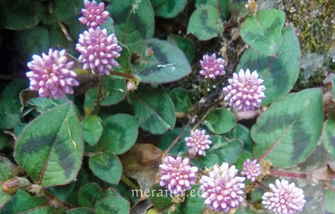 Der Knöpfchen-Knöterich (Persicaria capitata H. Gross) ist eine zierliche bodendeckende Pflanze. An niederliegend-kriechenden Stängeln, die an den Knoten wurzeln können, entspringen 3-4 cm große Blätter. Die Pflanze wächst an schattigen, auch felsigen Standorten und in Steingärten und kann dort schöne grüne Polster bilden. Die Blattspreite trägt eine halbkreis- bis V-förmige rötlichbraune Zeichnung und der Blattrand ist mit Haaren rötlich gesäumt. Die weißlich-rosafarbenen bis rötlichen Blüten sitzen in kugelförmigen, 1-2 cm großen Köpfchen endständig an aufsteigenden Seitenzweigen.
