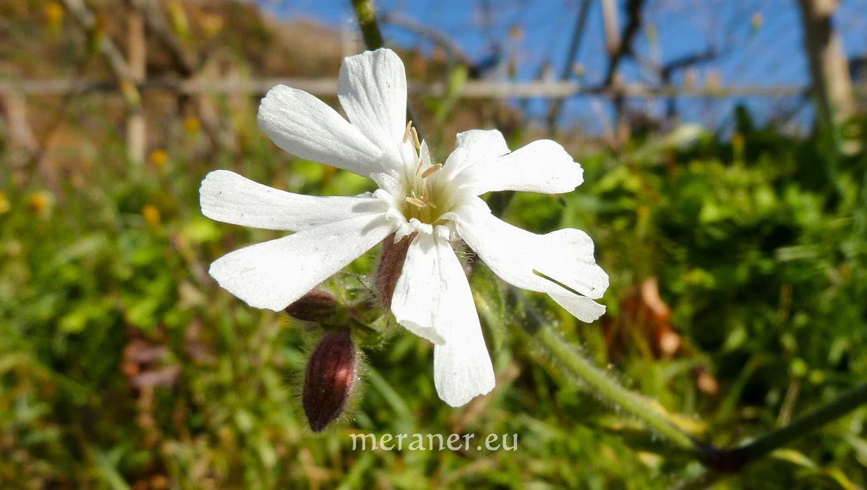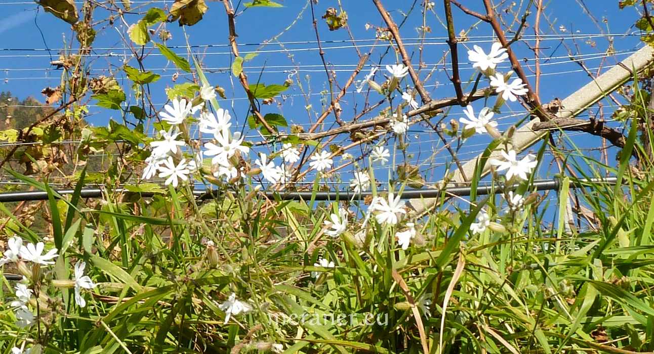 Die Weiße Nachtnelke (Silene latifolia ssp. alba (Mill.) Greut. & Burd.), die auch als Weiße Lichtnelke bekannt ist, ist in Europa und Asien beheimatet und in ganz Südtirol weit verbreitet, von den Tallagen bis etwa 1500 m ü.M.. Man findet sie an Wegen und am Rand von Reb- und Apfelanlagen, an Waldrändern und Schuttplätzen, vorwiegend an hellen, stickstoffreichen Standorten. Der Artname latifolia = breitblättrig bezieht sich auf die Blattform.