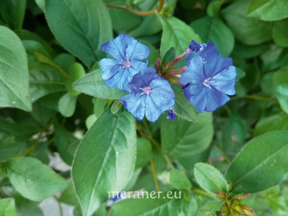Die Kriechende Hornnarbe (Ceratostigma plumbaginoides Bunge) oder Chinesische Bleiwurz (Herkunft China) ist eine ausdauernde, krautige, sommergrüne Staude, die mit kriechenden und reich verzweigten Trieben den Boden bedeckt. Die Triebe tragen bewimperte, jung rötliche, später sattgrüne Blätter, die sich im Herbst rotbraun verfärben. Die leuchtend blauen Blüten stehen in dichten endständigen Köpfchen. Aus einer langen Röhre breiten sich die Kronblätter tellerförmig aus. Der Name Hornnarbe beschreibt die fünf hörnchenartigen Narben des Blütengriffels (vom griechischen kéras = Horn und stígma = Narbe). Die Samen sind in Kapselfrüchten enthalten. Die Pflanze wird gerne zur Begrünung von trockenen Böschungen und Trockenmauern verwendet.