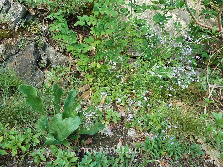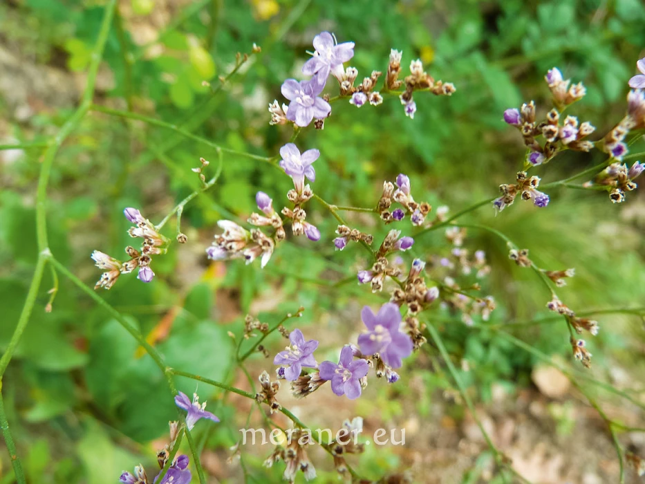 Beim Meerlavendel, der am Tappeinerweg gepflanzt ist, könnte es sich um den Breitblättrigen Strandflieder (Limonium latifolium (Sm.) Kuntze) handeln. Es ist eine mehrjährige, krautige Staude, deren Blätter einer Pfahlwurzel entspringen; die Blätter bilden eine Grundrosette, sie sind zungenförmig, ganzrandig und fein behaart. Die kleinen, hellvioletten (lavendelfarbigen) Blüten stehen in schleierkrautähnlichen, einseitswendigen Rispen an bis 50 cm langen, verzweigten Blütenständen. Es gibt mehrere Sorten, die sich in der Blütenfarbe unterscheiden. Wegen der drahtigen Blütenstände und der haltbaren zarten Blüten wird die Pflanze auch gerne als Schnitt- und Trockenblume verwendet. (Zur Zeit verfärben sich die Blätter braun und der Blütenstängel ist abgeschnitten)