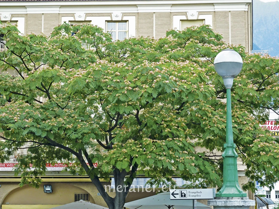 Albizia-Arten sind mit ihrem filigranen, feingefiederten Laub, dem außergewöhnlichen, mimoseähnlichen Blütenschmuck und den flach gewölbten Schirmkronen sehr elegante, attraktive Blütengehölze. In Mitteleuropa ist nur die wärmebedürftige Albizia julibrissin in wintermilden, sonnigwarmen Standorten ausreichend frosthart.
